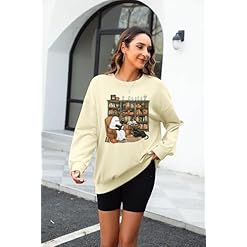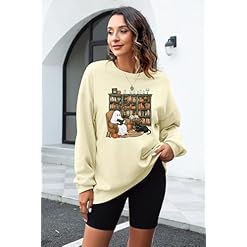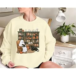 This Halloween sweatshirt is surprisingly versatile. Pair it with jeans and sneakers for a casual daytime look, or dress it up with leggings and boots for a more polished ensemble. Layer it under a jacket or cardigan for added warmth on colder days. The neutral color palette of the sweatshirt allows it to blend seamlessly with a variety of outfits, making it a go-to piece in your autumn wardrobe. Whether you’re heading to a book club meeting, a library event, or a spooky movie night, this sweatshirt is the perfect choice.